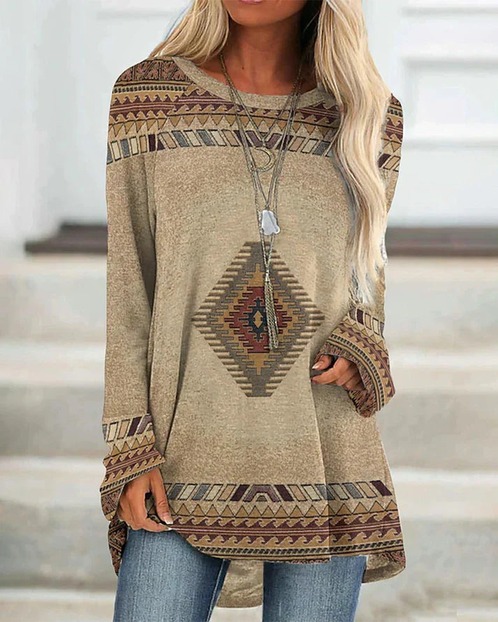 Bring effortless warmth and laid-back style to your everyday wardrobe with the Ariella - Boho Printed Long Sleeve. Designed with a relaxed silhouette and earthy geometric detailing, this top is perfect for cozy days, casual outings, and effortless layering through the seasons.